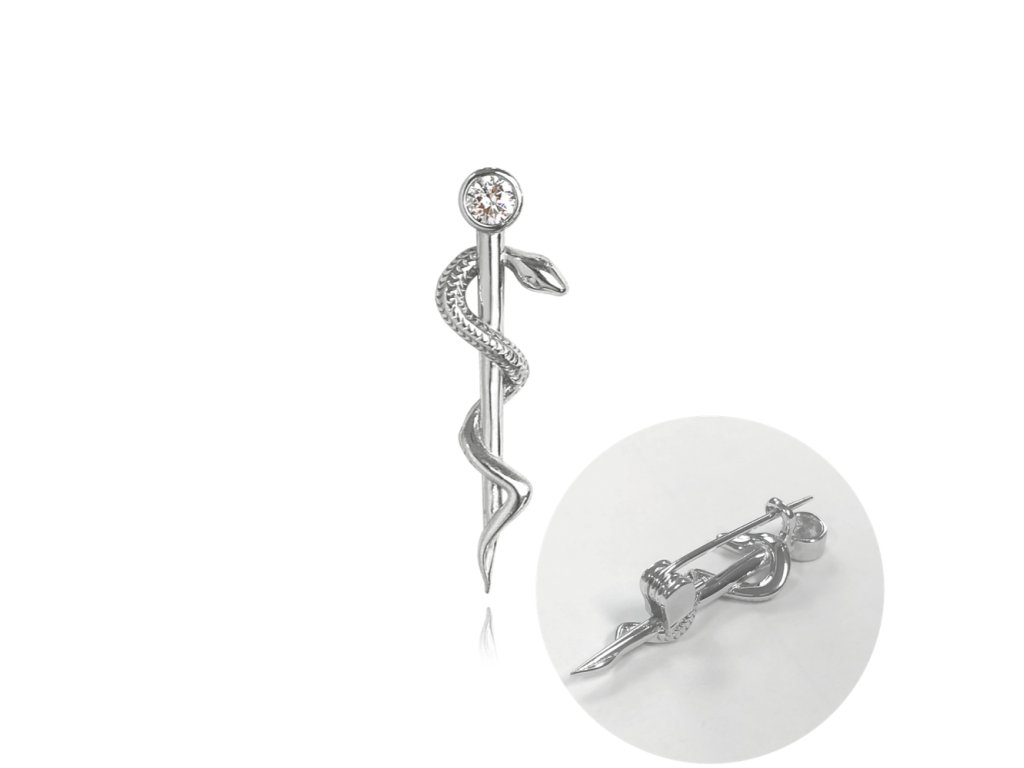 MINET Stříbrná brož AESKULAPOVA HŮL s bílým zirkonem