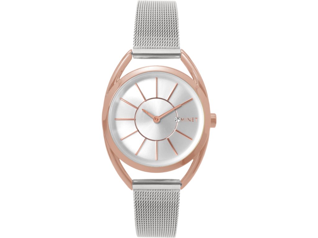 Elegantní hodinky české značky MINET s pouzdrem v barvě růžového zlata a moderním stříbrným ocelovým řemínkem milánského typu. Barva se z pouzdra hodinek díky speciální technologii nikdy neoloupe. Vyměnitelný řemínek se snadným systémem zkracování se přizpůsobí obvodu ruky. Hodinky jsou vyrobeny z hypoalergenní nerezové oceli.• kvalitní materiály