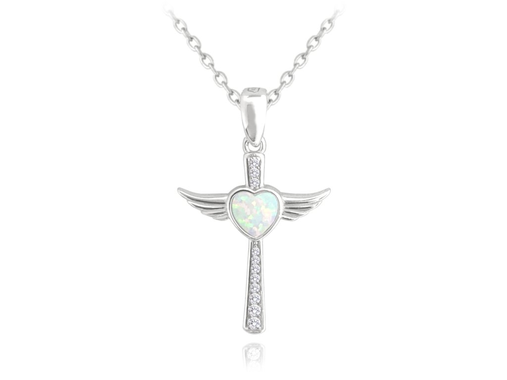 MINET Stříbrný náhrdelník ANDĚLSKÝ KŘÍŽEK s bílým opálovým srdíčkem