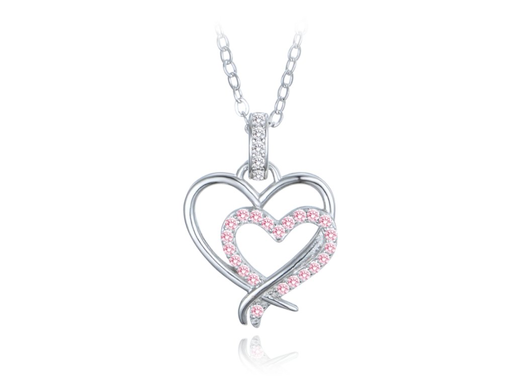 MINET Stříbrný náhrdelník dvojité srdce s bílými a růžovými zirkony