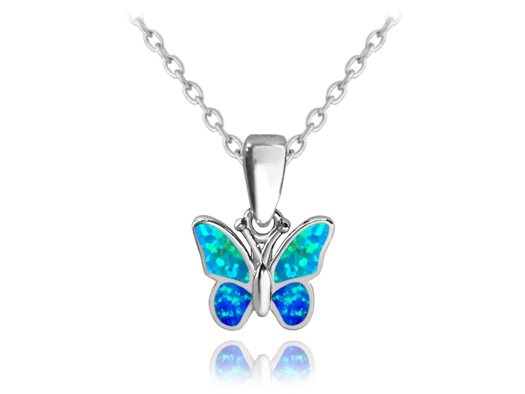 MINET Třpytivý dětský stříbrný náhrdelník MOTÝLEK s modrým opálem