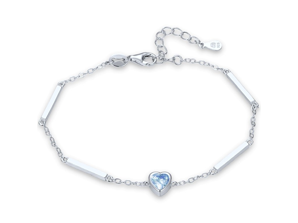 Stříbrný náramek MINET se srdcem je vyroben ze stříbra Ag 925/1000 s rhodiovaným povrchem, který pomáhá udržet jeho barvu i lesk. Světle modrý zirkon dodává jemný barevný akcent a decentní styl je vhodný pro každodenní i elegantní nošení.MATERIÁL: stříbro 925/1000