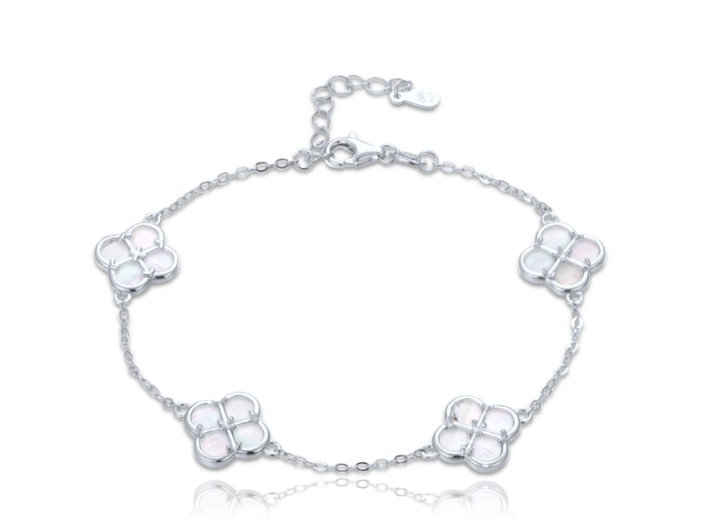 MINET Stříbrný náramek čtyřlístky s bílou perletí