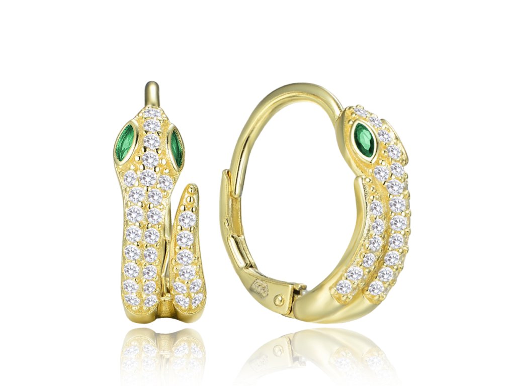 Šperky MINET spojují jemnost, kvalitu a elegantní výraz. Náušnice jsou vyrobeny z pravého stříbra Ag 925/1000 pokoveného vrstvou 14k zlata. Mají motiv hada a zdobí je bílé a zelené zirkony. Zapínání je řešeno patentem pro bezpečné nošení.MATERIÁL: stříbro 925/1000