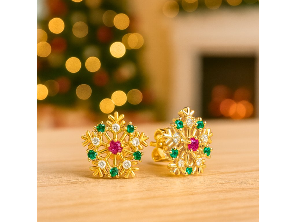 MINET Pozlacené stříbrné náušnice SNĚHOVÉ VLOČKY s barevnými zirkony