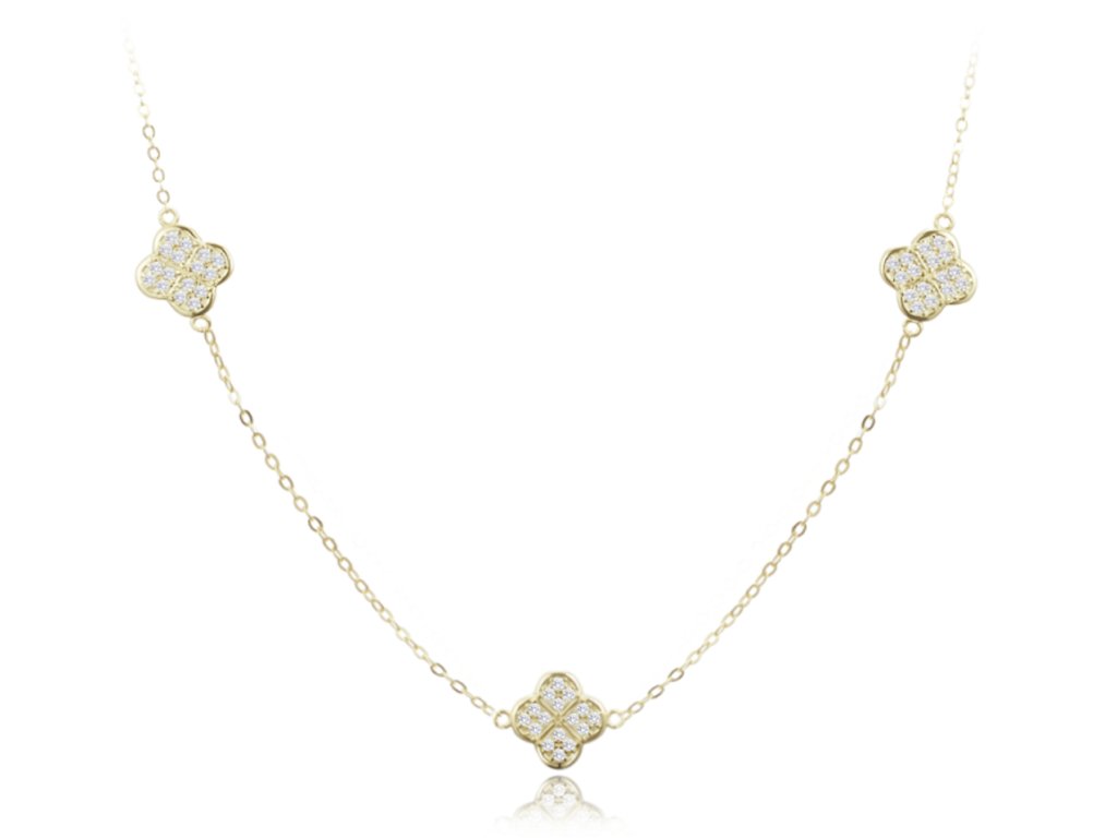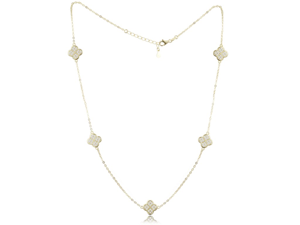 MINET Pozlacený stříbrný náhrdelník čtyřlístky s bílými zirkony