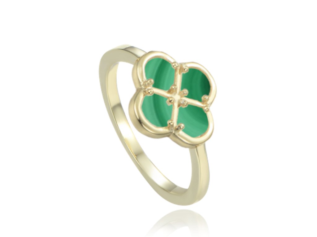MINET Pozlacený stříbrný prsten čtyřlístek se zeleným malachitem vel. 50