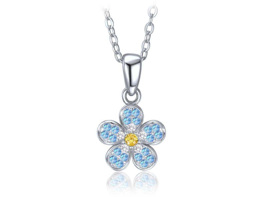 MINET Dětský stříbrný náhrdelník kytička s modrým, bílým a žlutým zirkonem