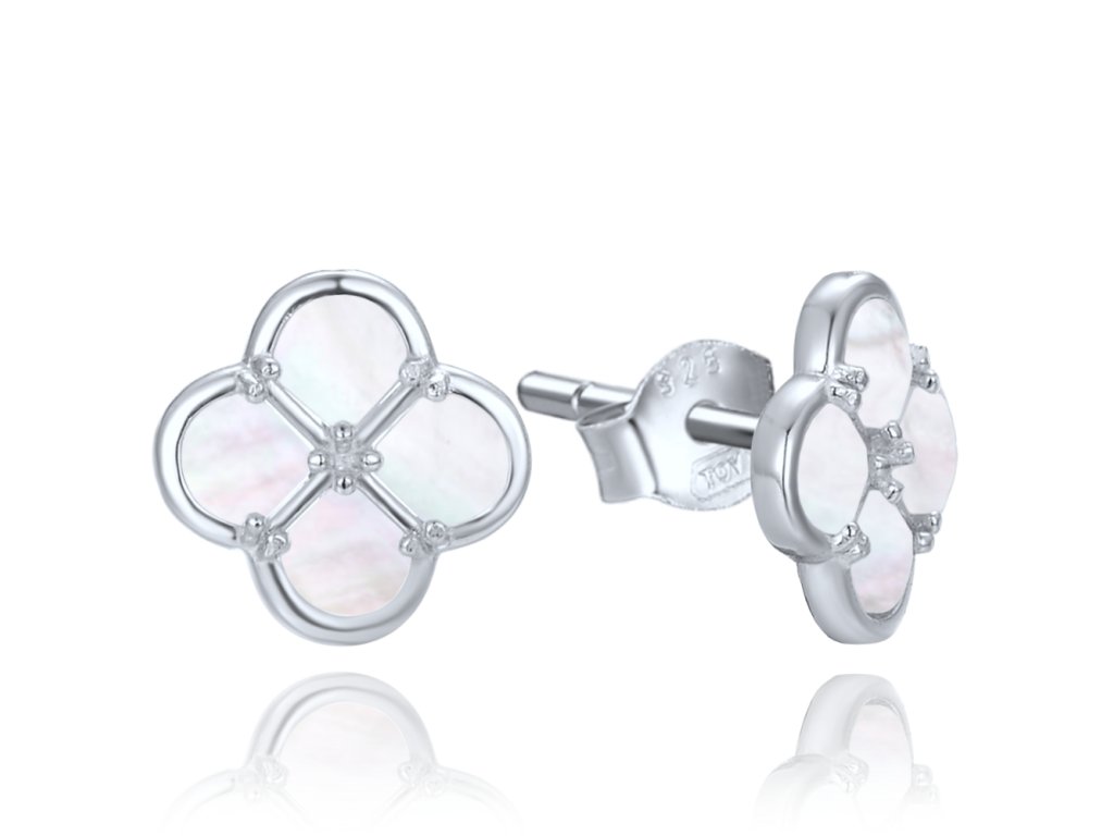 MINET Stříbrné náušnice čtyřlístky s bílou perletí