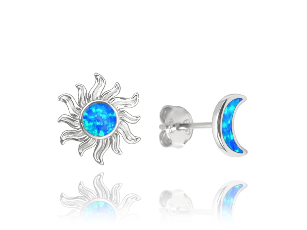 MINET Stříbrné náušnice SLUNCE a MĚSÍC s modrými opály