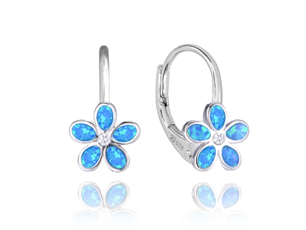 MINET Třpytivé dětské stříbrné náušnice KYTIČKY s modrými opálky a zirkonem