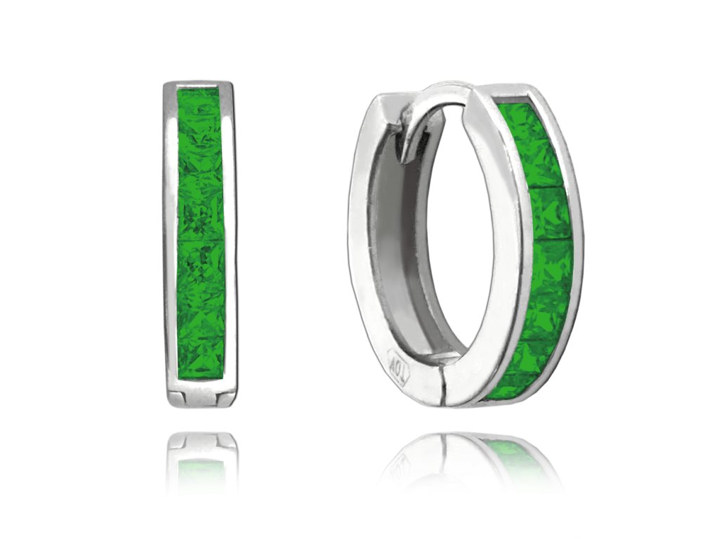 Zelené náušnice kroužky jsou díky praktickému zapínání a tvaru pohodlné pro každodenní nošení. Zelené zirkony se krásně třpytí a ozvláštníte jimi svůj outfit. Povrch stříbra je z rhodia, náušnice tedy neztratí svůj zářivý lesk a barvu.MATERIÁL: stříbro 925/1000
