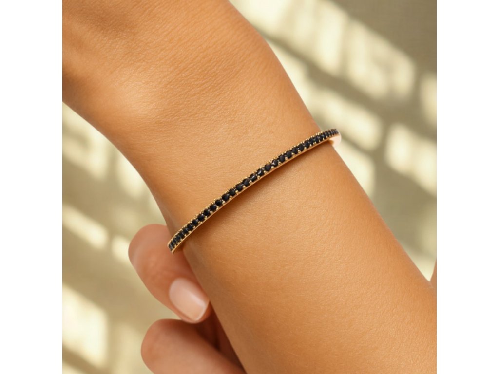 Luxusní zlatý náramek s černým zirkonem z pravého 14karátového zlata upoutá kontrastem barvy a lesku. Elegantní doplněk pro ženy, které hledají originalitu. Šperky jsou opatřeny puncem potvrzujícím ryzost 585/1000. Pociťte sílu sebevědomí, které vám dodají zlaté šperky české značky MINET. Vyzdvihněte svůj osobitý styl a dopřejte si pocit výjimečnosti, díky kterému bude váš outfit dokonalý.MATERIÁL: zlato 585/1000