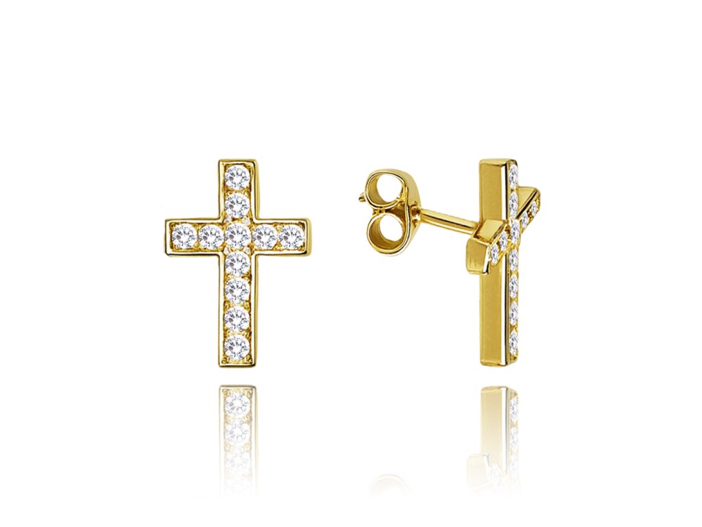 MINET Luxusní zlaté náušnice křížky s bílými zirkony Au 585/1000 1,10g