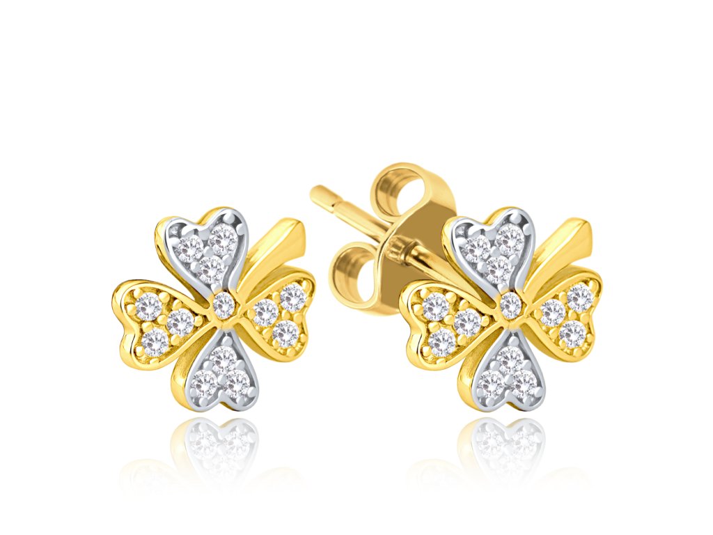MINET Zlaté náušnice čtyřlístky s bílými zirkony Au 585/1000 1,70g