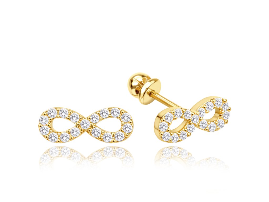 MINET Zlaté náušnice nekonečna na šroubek s bílými zirkony Au 585/1000 1,25g